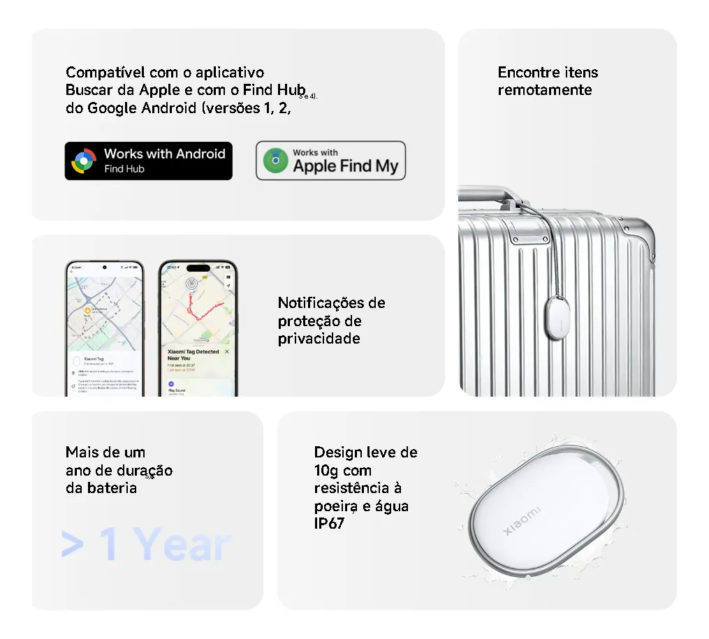Nunca mais perca suas chaves, mochila ou mala. Compatível com Apple Find My e Google Find Hub (Android). • Funciona com iPhone (iOS 14.5+) • Funciona com Android 9+ • Bateria com duração superior a 1 ano • Leve e compacto (apenas 10g) • Resistente à água e poeira IP67 • Modo Perdido com contato via NFC • Alertas de item esquecido (Apple Find My) Produto 100% original Xiaomi. Envio via Mercado Envios (mais rápido que Correios). Garantia de 1 ano. O Xiaomi Tag é um rastreador inteligente que permite localizar seus objetos através do aplicativo oficial Apple Find My ou Google Find Hub. Ele emite um sinal Bluetooth seguro que é detectado por celulares próximos. Esses aparelhos atualizam automaticamente a localização no mapa dentro do aplicativo, de forma criptografada e privada. Ideal para: • Chaves • Mochilas • Carteiras • Malas de viagem • Equipamentos Compatível com Apple e Android (não funciona nos dois ao mesmo tempo). INFORMAÇÕES IMPORTANTES – Compatível com iPhone e iPad – Compatível com Android – Redes Apple e Google funcionam separadamente – Bateria substituível com autonomia superior a 1 ano – Resistente à água IP67